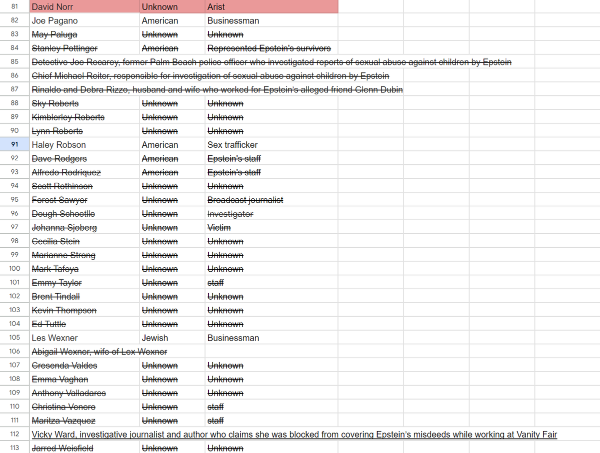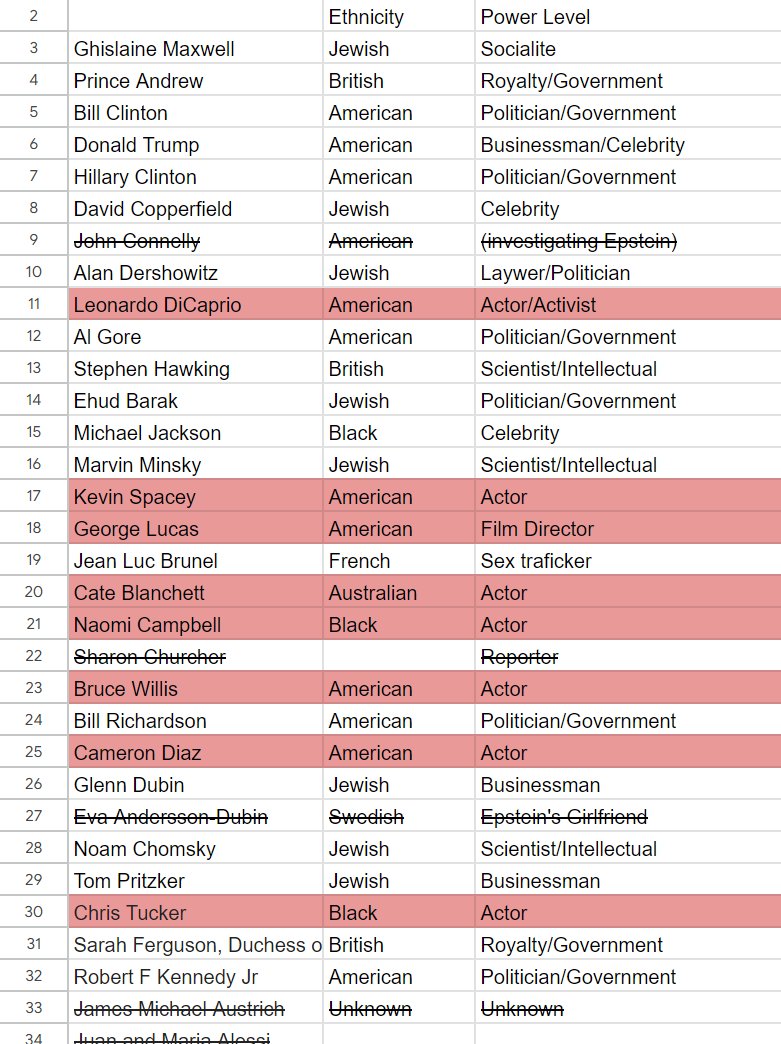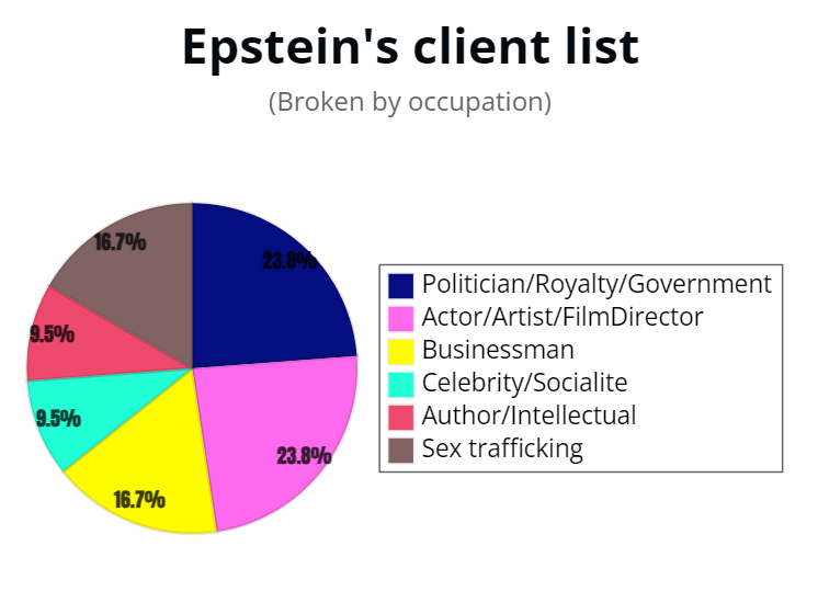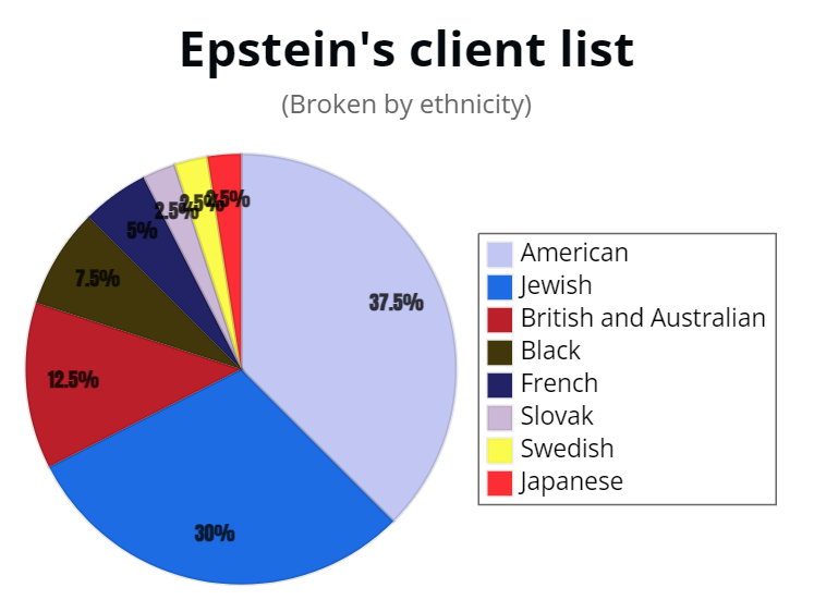 Powerful people with money and influence, but also a good amount of actors, celebrities' and sex traffickers comprised Epstein's list. I was unable to identify the occupation and ethnicity for the vast majority of guests due to them being unknown, but generally the White-Jewish proportions remain the same but a little lower. That is the methodology:
