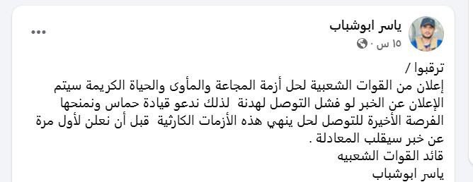 A statement from the Popular Forces regarding the resolution of the crises of hunger, shelter, and a dignified life will be announced shortly, if efforts to resolve them fail. Therefore, we call on the Hamas leadership to seize this final opportunity to find a solution that ends these catastrophic crises before we announce, for the first time, news that will change the equation.