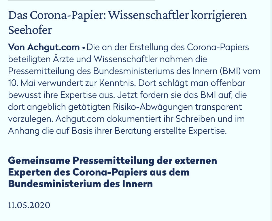 In einem Offenen Brief forderten diese am 11.05.20 die transparente Offenlegung der Risiko-Abwägungen der Bundesregierung bei der Beurteilung von Nutzen und Schaden der drakonischen Maßnahmenpolitik: