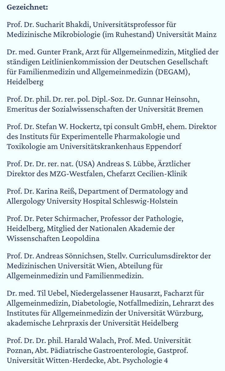 2/ Unter den Mitwirkenden befanden sich u. a. Prof. Dr. Peter Schirmacher von der LEOPOLDINA, Toxikologe Prof. Dr. Stephan Hockertz @DrHockertz, Prof. Dr. Andreas Sönnichsen @AndiSoenn von der Univ. Wien, Dr. med. Gunter Frank von der DEGAM, Prof. Dr. S. Bhakdi u. a. m. - Wissenschaftler also, die aufgrund ihrer Courage, gängige Corona-Narrative infrage zu stellen, auf inhumane Art und Weise von Politik, Wissenschaftskollegen und Medien teils bis zur persönlichen Vernichtung verunglimpft wurden.