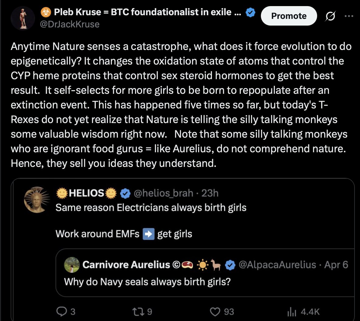 9. My X post to the bozo food guru mentioned the CYP heme protein, which control steroid hormones production, which are chiral proteins that would indeed leverage polarized light to modulate hormone synthesis epigenetically, influencing sex ratios post-catastrophe (e.g., more females born after electrical injury).