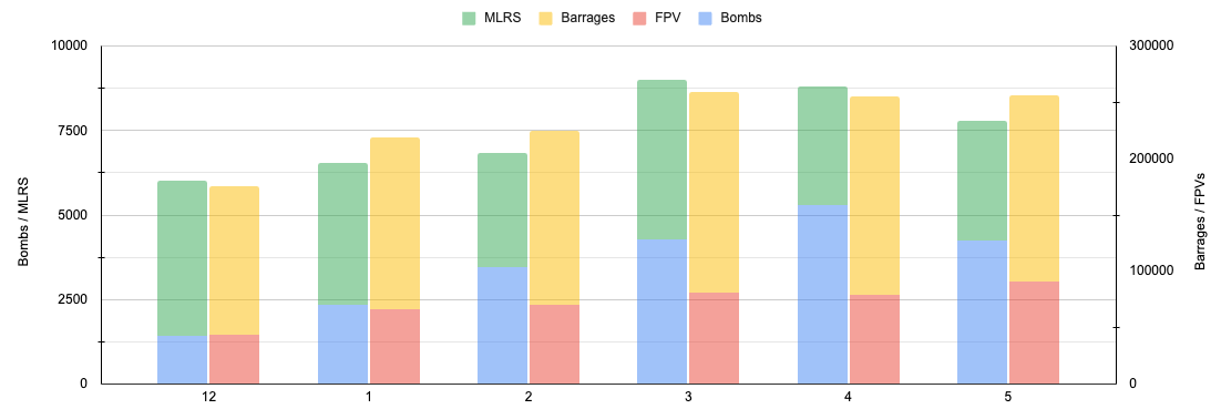 @M0nstas also gathered statistics from UA general staff claims of attacks : here, we can see that FPV drones are more and more important.