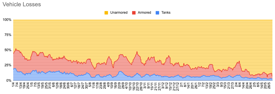 We can also see that on the number of losses, with less and less losses of armoured vehicles and tanks compared to unarmored vehicles.