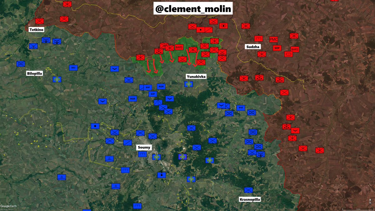 In Sumy, russian forces continue to push accross the border after pushing back ukrainians from Kursk.