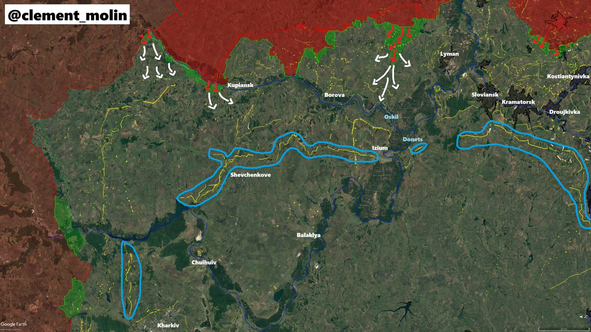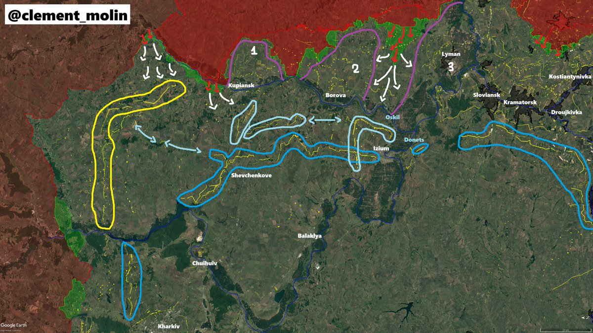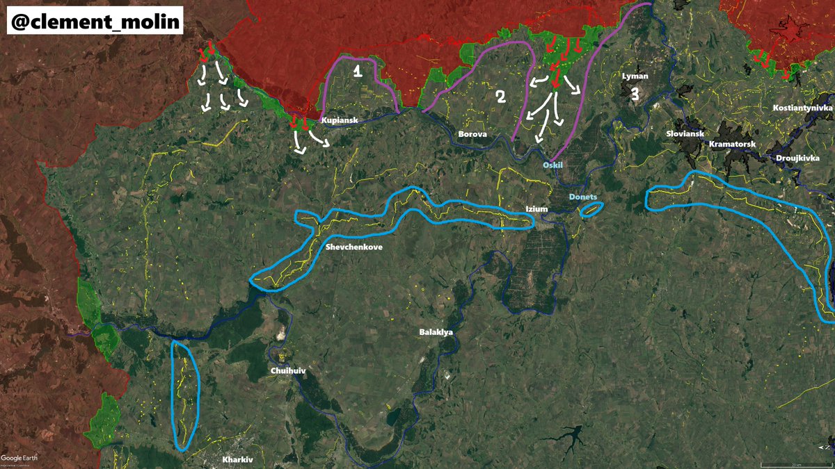 As you can see on the previous map, russian army is trying to isolate ukrainian forces in 3 different zone near the Oskil river :