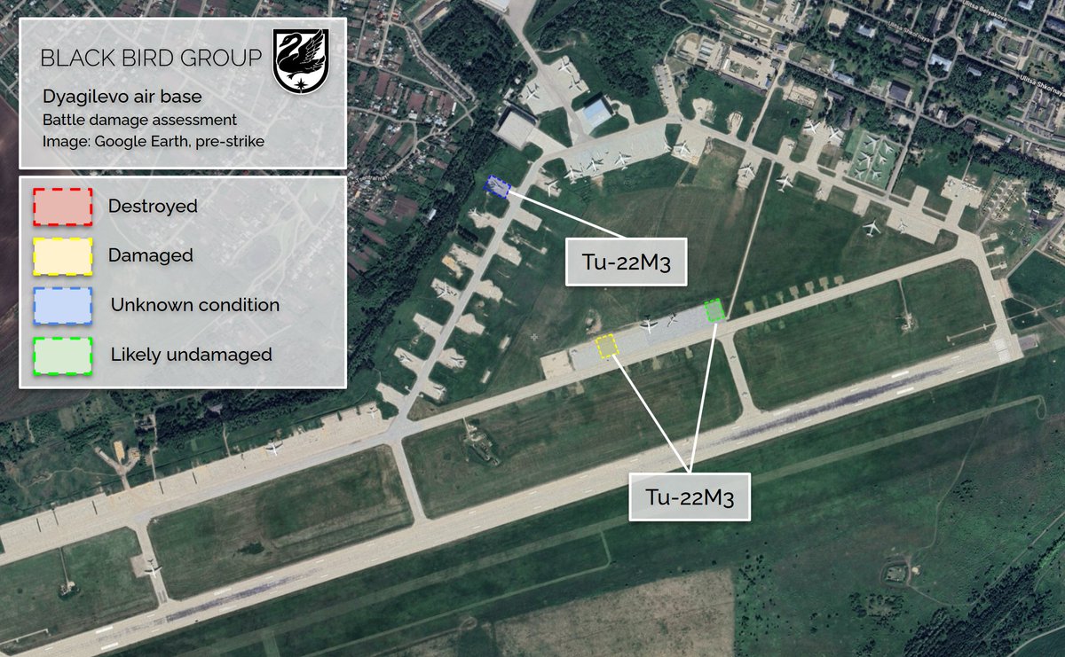 Before the operation, Russia most likely had less than 100 operational strategic bombers in operational condition, so likely somewhere between 11-14% of Russian strategic bombers have been destroyed. Total losses are higher, but difficult to exactly estimate. 14/