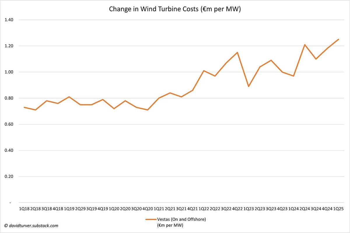 The CCC's forecasts make even less sense when you consider that Vestas turbine prices have risen some 76% since 4Q20 and the trend is still up. New orders were taken at €1.25m/MW in 1Q25 as an average across onshore and offshore (5/n)