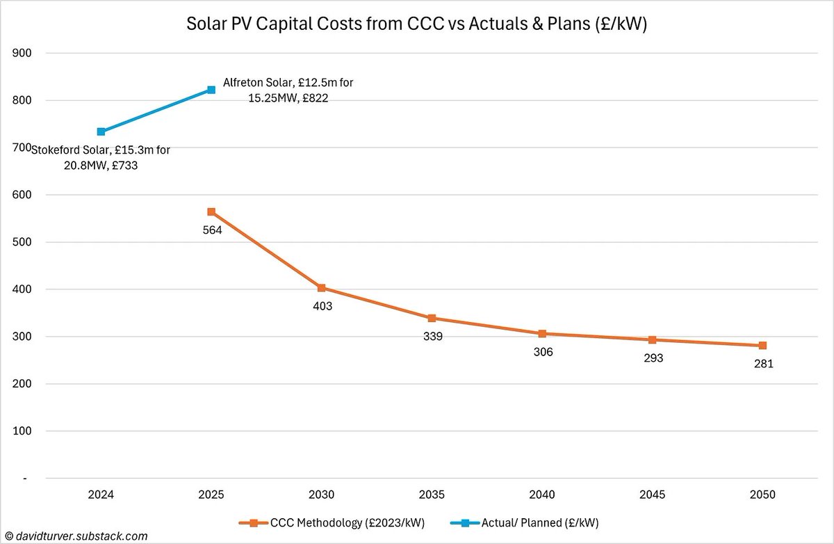 Alfreton and Stokeford solar farms were awarded contracts in AR4 and activated their CfDs earlier this year. Their accounts up to end 2023 show both had already spent much more than the CCC's estimate of the cost of solar for 2025 delivery (8/n)