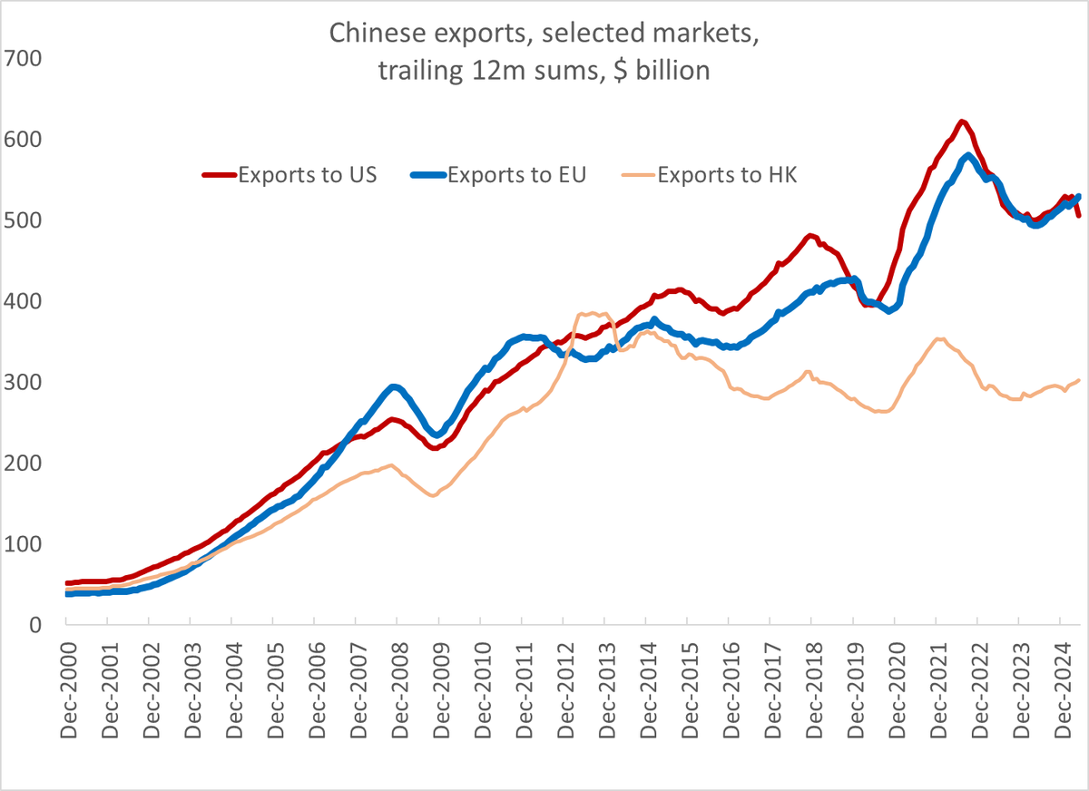 The trade war impact is there if you know where to look -- exports to the US were ~ $30b, and they normally would be ~$50b. The trailing 12m of exports to the US isn't tracking exports to Europe (an easy test)