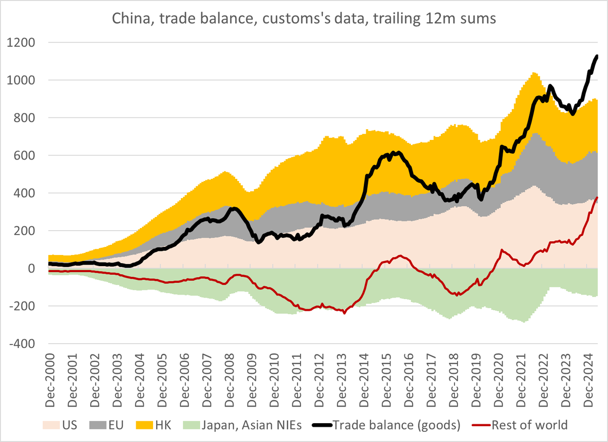 Don't think Xi is feeling that much pressure from Trump's trade war. Exports to the US dipped, but exports to the rest of the world largely offset. The overall monthly goods surplus still topped $100b/ is on track to hit $1.2 trillion (gulp)