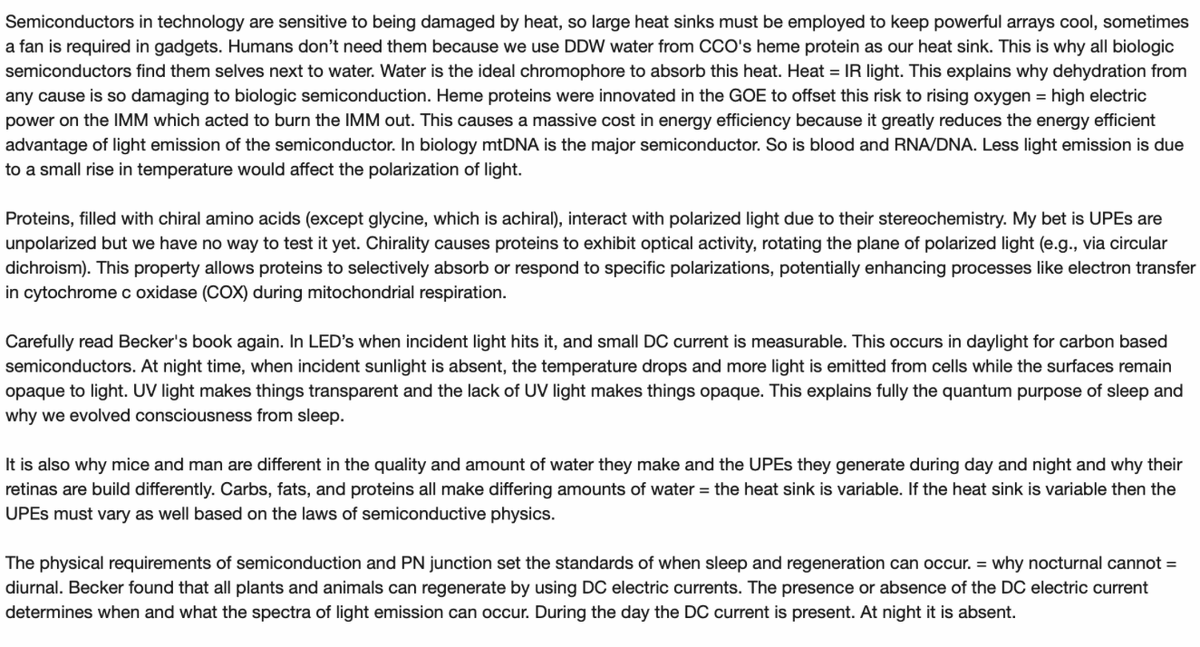 5. This UV quantum effect allows for future melanin superpowers seen in mammals post-KT event to interact with water in their bodies to create ATP without total reliance on oxygen. When melanin is hydrated and in the presence of full-spectrum light, there is water molecule dissociation and ongoing transforming energy. This meant ATP could be created almost completely from the energy that emanates from the melanin by the charge separation of water inside of cells. Water is a semiconductor in mammals and so are all the things that are transcribed from DNA. Proteins cannot be used to make the ideal LED light unless the right type of water surrounds it. If it does the quality of the light, its spectra, and the number of photons is altered. Water is also a heat sink for our photolithographic factories in cells.