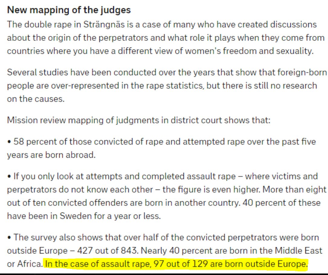 10/ In Oslo, Norway's capital city, an article from their state broadcaster revealed that every single assault rape between 2006-2009 was committed by a non-Western immigrant.
