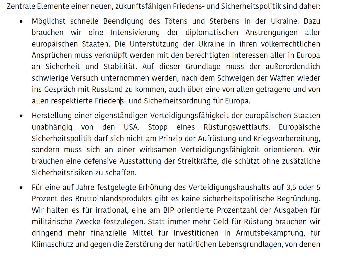 um sofort danach jedweder tatsächlichen Stärkung militärischer Macht zur strategischen Abschreckung eine Absage zu erteilen, finanziell, materiell, und intellektuell. Das Manifest verliert kein Wort über die Bedrohungsanalyse Deutschlands und der NATO, dass Russland bis 2029