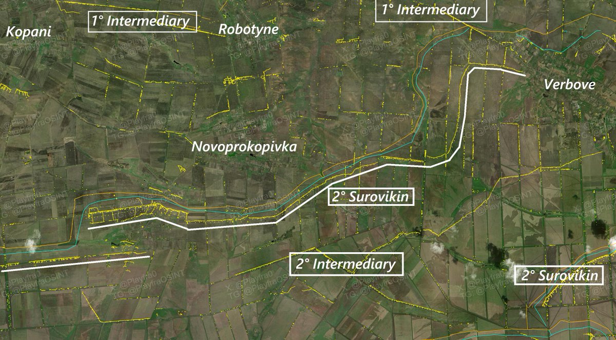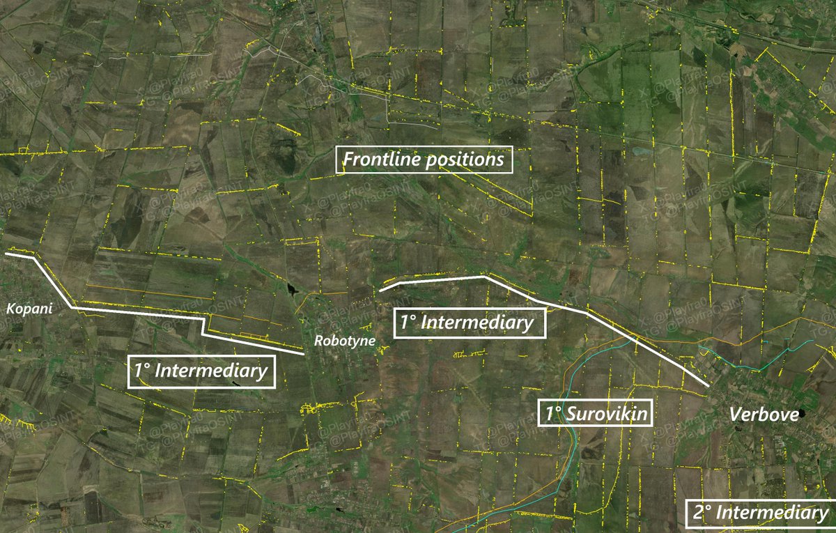 Immediately after the 1° Surovikin line, we encounter the 2° Intermediary. This line was meant to not give Ukrainians breathing and maneuvering room after they captured the 1° Surovikin line and to prepare, again, for another Ukrainian punch to the 2° Surovikin line further south.