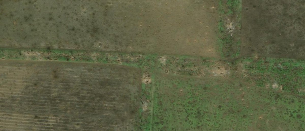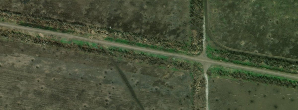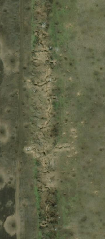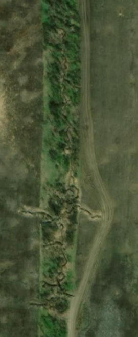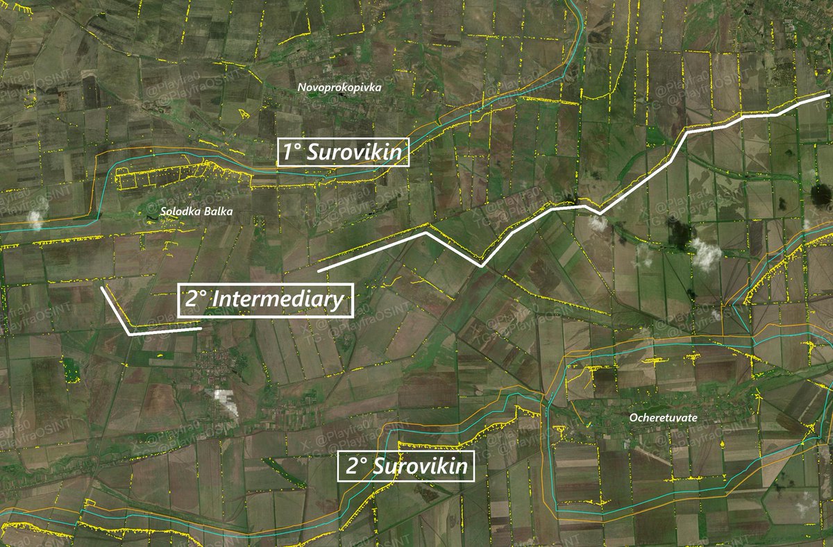 The next we find is what I call the "1° Intermediary line". I call it this because it is situated between the frontline fallback positions and the 1° Surovikin line, and because it is not a full-fledged line, as it was too close to the frontline to bring in heavy equipment to dig better trench systems, anti-tank ditches and place dragon's teeth.