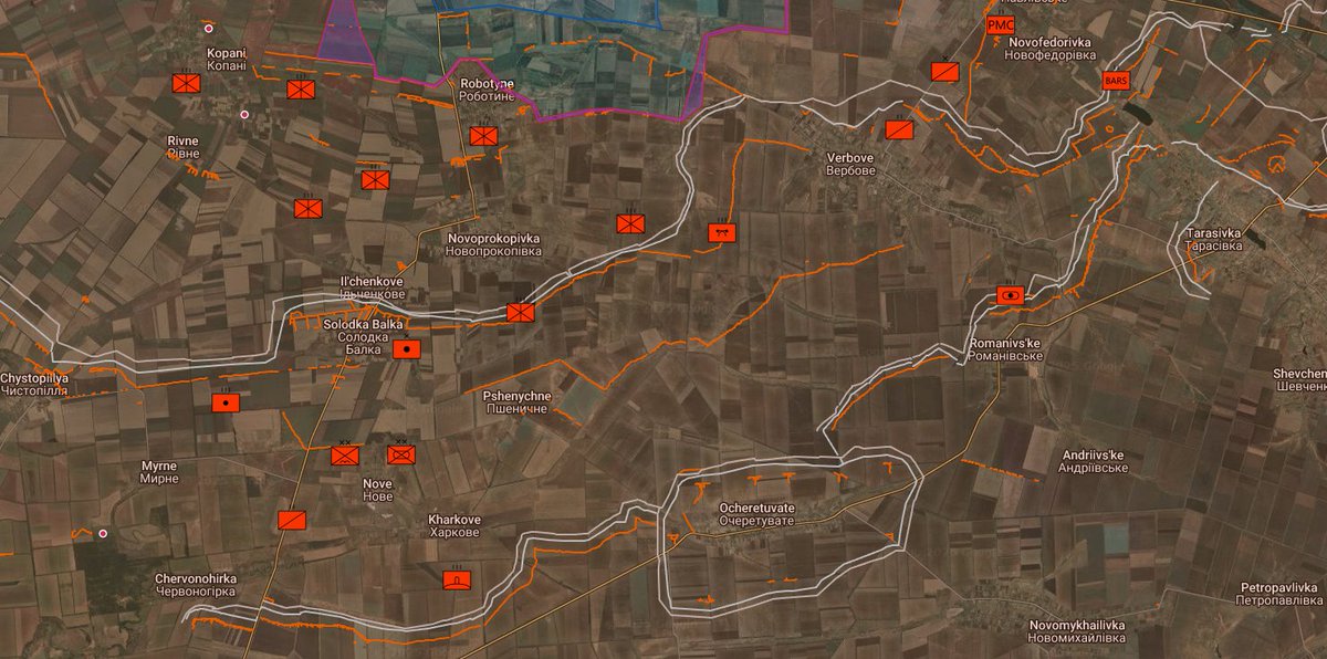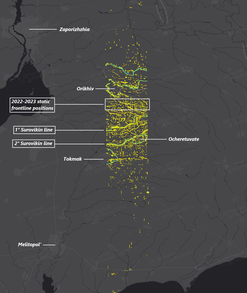 You can clearly see the slice I was talking about. 3 rings are visible: at 1/3 (north to south) on the left you can see the Orikhiv defensive ring, at 1/2 on the right is the Ocheretuvate node, and just southwest of it is Tokmak, which also has its own defensive ring.