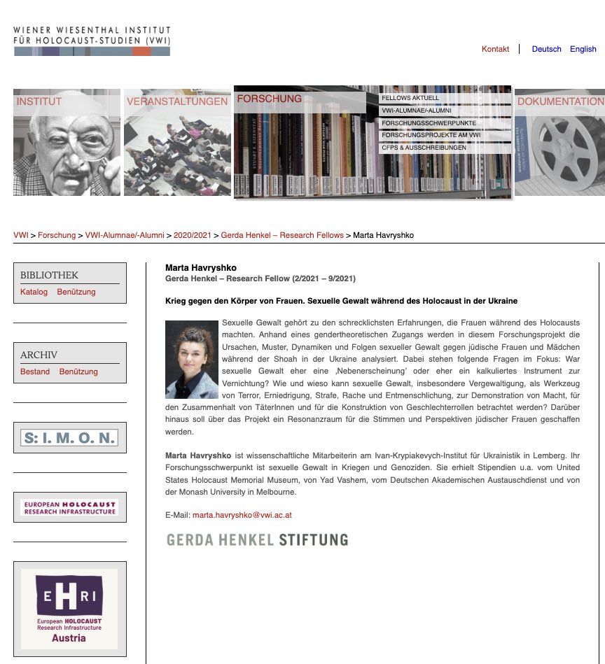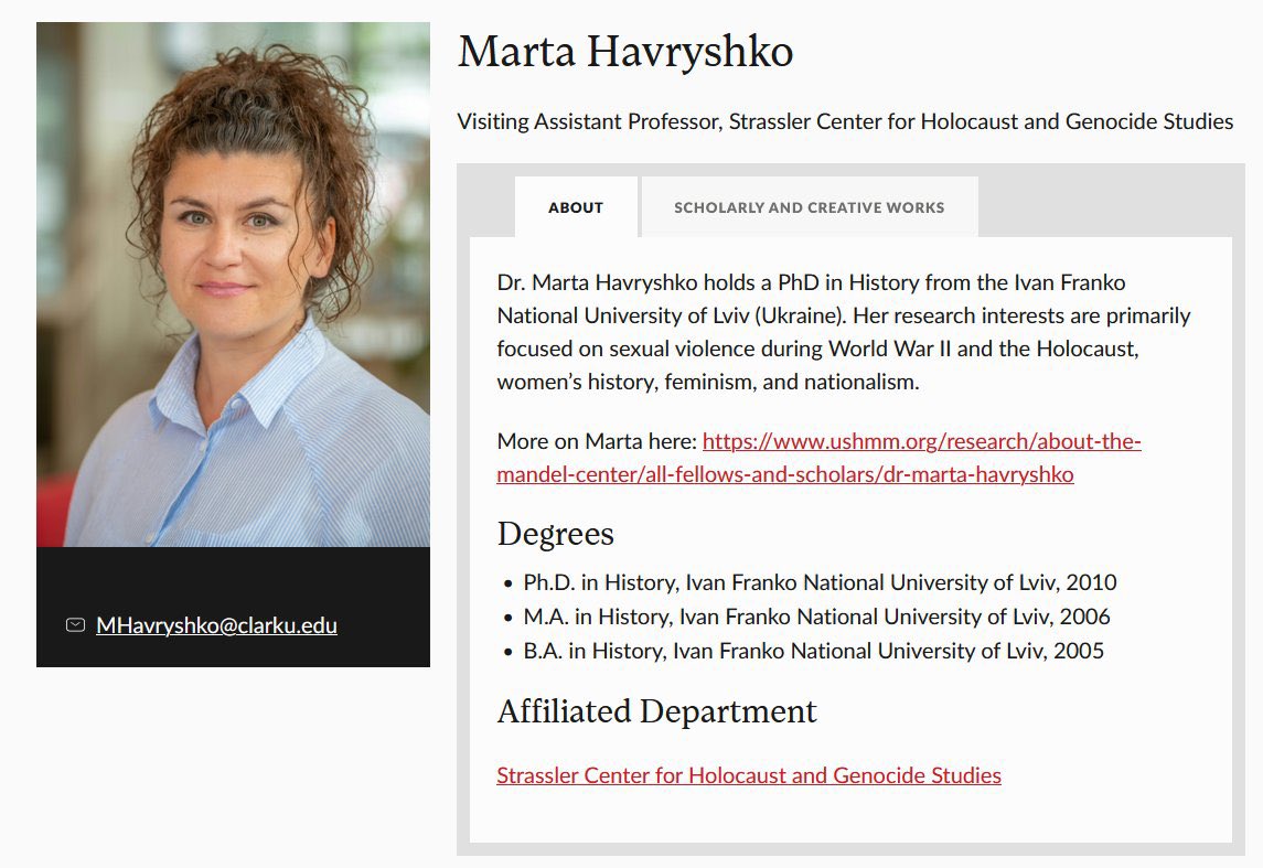 Marta stammt aus der 🇺🇦. Sie studierte an der Ivan Franko Universität in Lwiw Geschichte & promovierte 2010. Ihre akademische Arbeit konzentrierte sich auf geschlechtsspezifische Gewalt & Kriegsverbrechen, inkl. Artikel über Sexualverbrechen in der besetzten Ukraine.