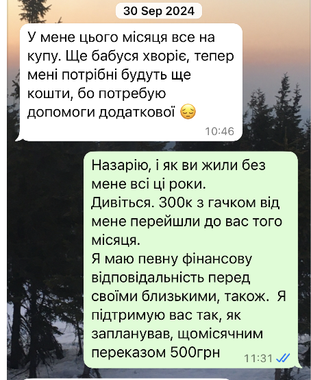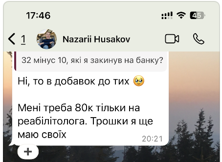 Пані Уляна з чоловіком і громадою задонатили Назарію близько 120 тис грн. Показова ця переписка з чоловіком Уляни: