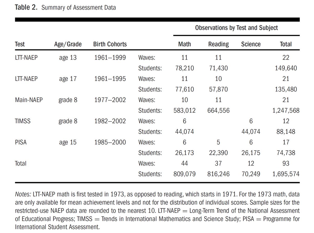 We use all tests that are psychometrically linked over time: LTT-NAEP, Main-NAEP, TIMSS + PISA.