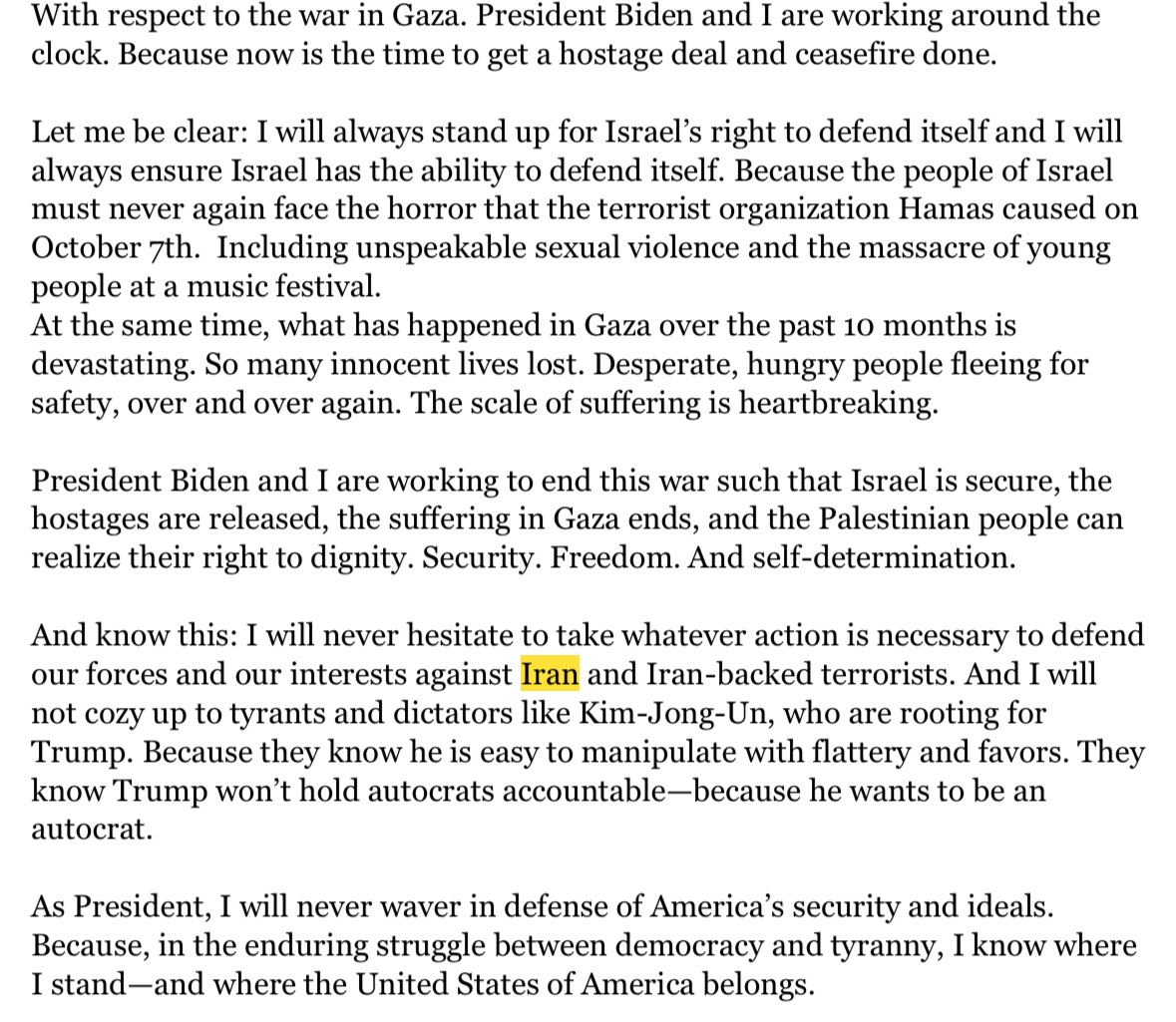 @adamjohnsonCHI I would love to hear Harris speak out against it. But just like the VP debate starting with Walz being asked if he would bomb Iran, Harris took precious seconds in her DNC acceptance speech to attack Iran. Statements like these make me think she would have followed Netanyahu too