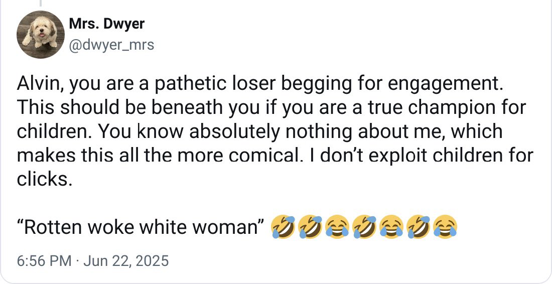 Here was CMA @dwyer_mrs’ response. Cowards like these woke white women are stuck. She can’t say she doesn’t support it (because she does) and she can’t say she supports it because she knows it makes her look like a monster.
