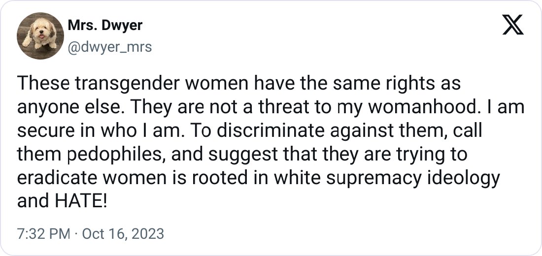 This evening’s example of an insufferable woke white woman who supports transgender mutilation surgeries for minors but is too scared to look like a monster comes by way of @dwyer_mrs