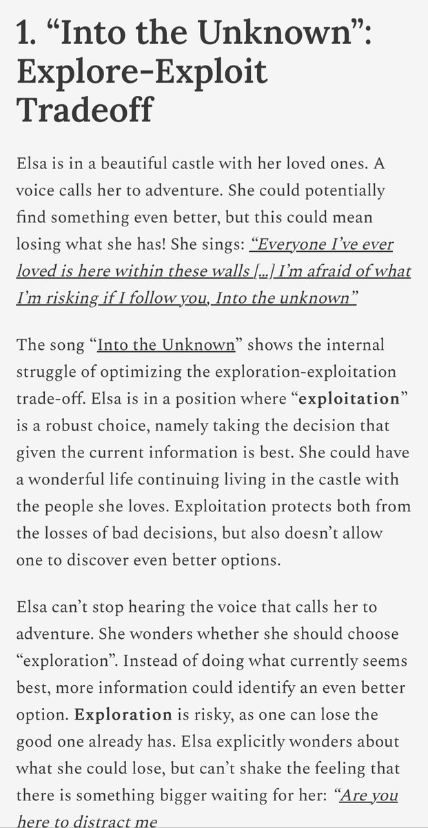 The song “Into the Unknown” shows the internal struggle of optimizing the exploration-exploitation trade-off…
