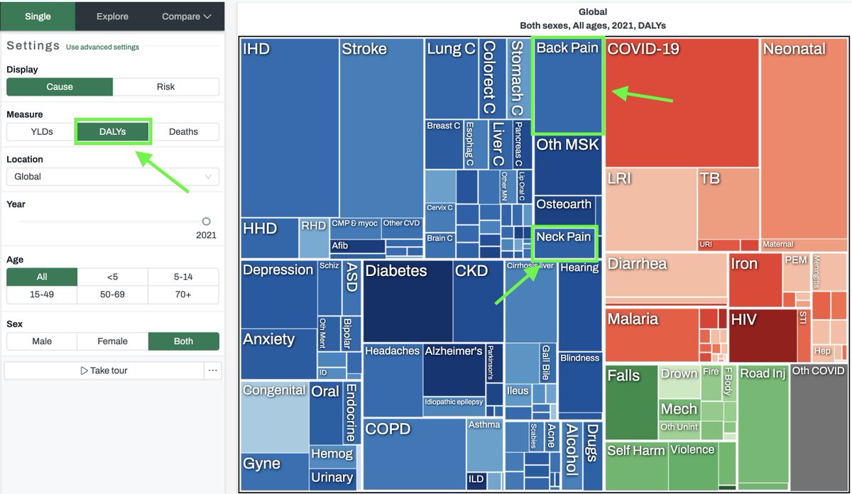 Eliminating back & neck pain might not sound important, so looking at the data might surprise you. While we have all heard of the prevalence of diabetes and heart disease, we are often ignorant of the "global burden of disease" of other causes.