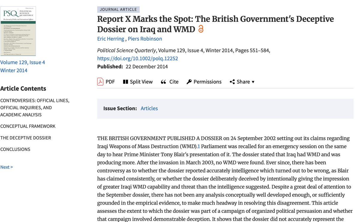 2) The overthrow of the Iraqi government in 2003 was underpinned by now documented deceptions regarding fictitious weapons of mass destruction. 315 000 dead, probably many more. Ensuing civil war was beset with extremist groups. academic.oup.com/psq/article/12…