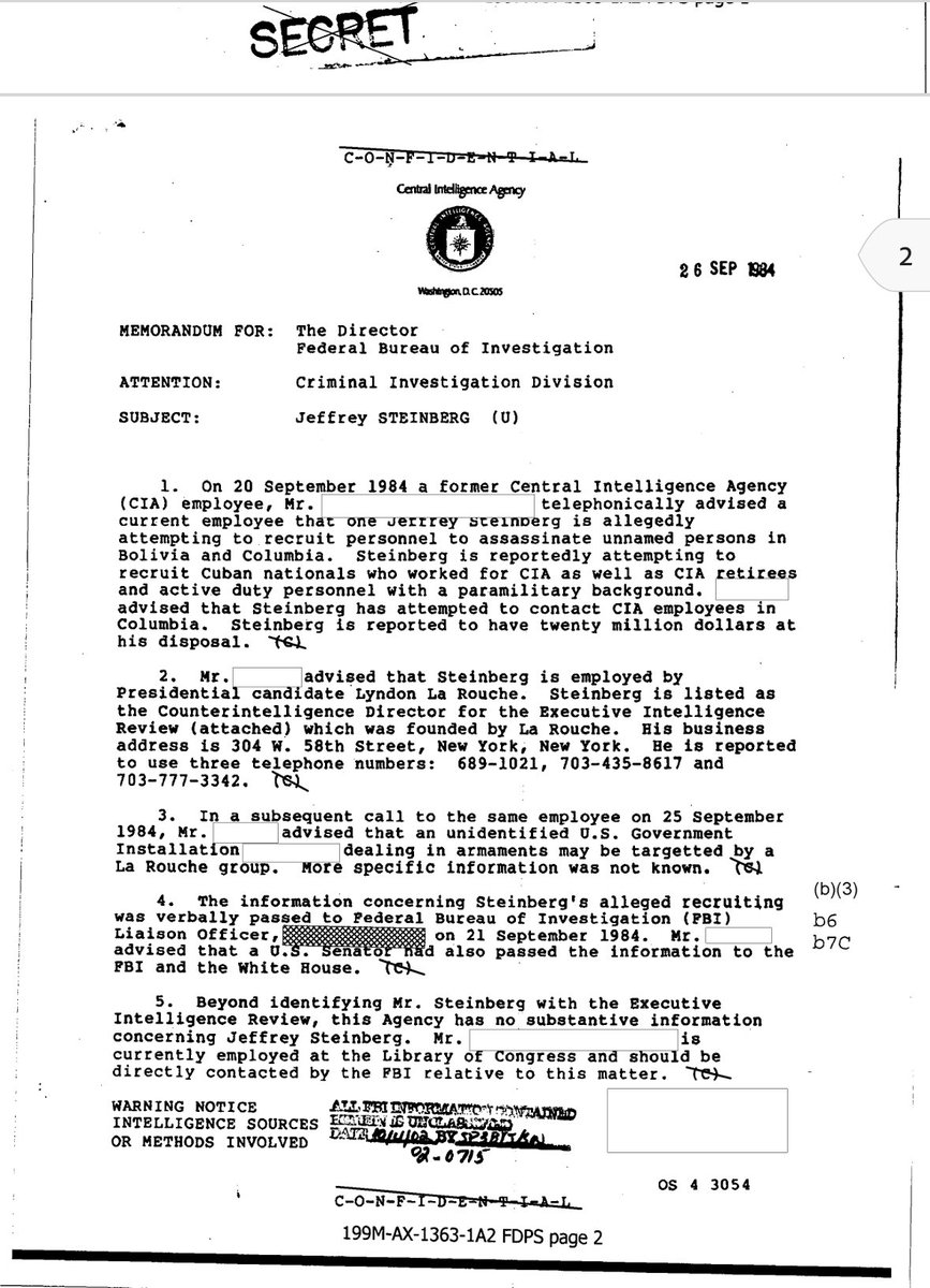 1984 CIA referal to FBI: “Jeffrey Steinberg is allegedly attempting to recruit personnel to assassinate unnamed persons in Bolivia and Columbia. Steinberg is reportedly attempting to recruit Cuban nationals who worked for CIA as well as CIA retirees and active duty personnel with a paramilitary background.”