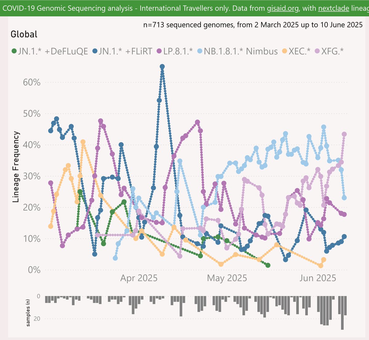 The XFG.* "Stratus" variant is also quite prevalent at around 19%. This is a novel scenario – until now I’ve only seen one or the other growing strongly in each country or region.