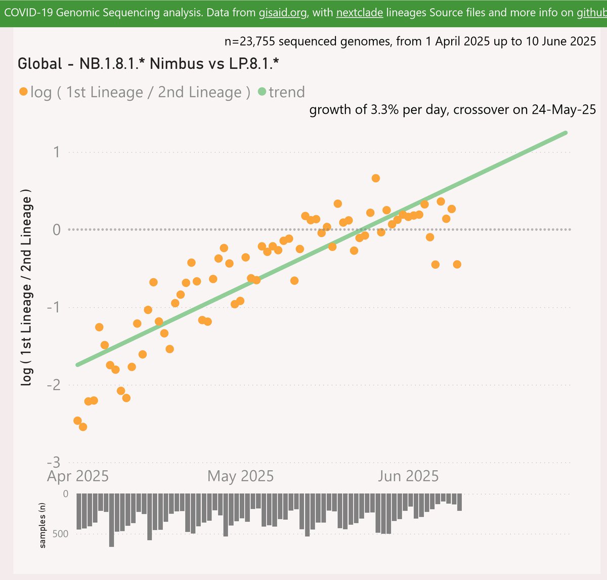 Globally, the NB.1.8.1 "Nimbus" variant is showing a slowing growth advantage of 3.3% per day (25% per week) over the LP.8.1.* variant, with a crossover in late May.