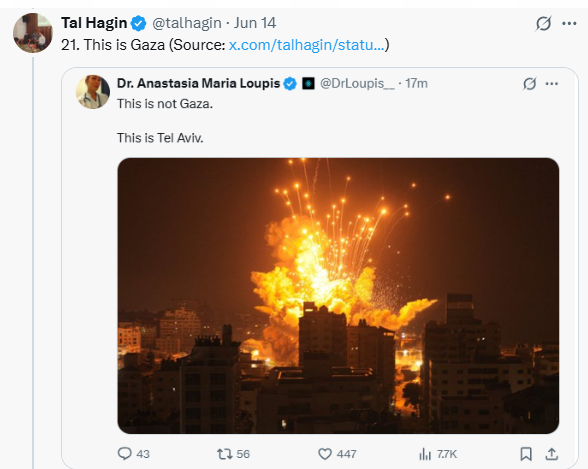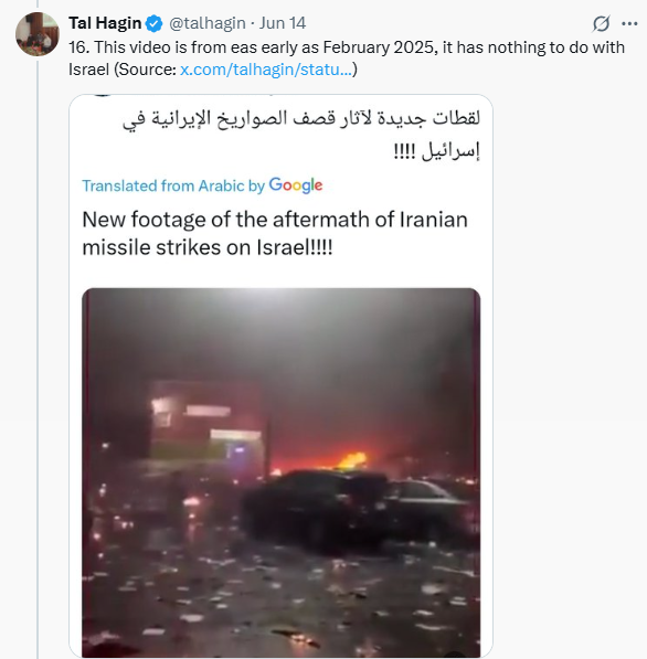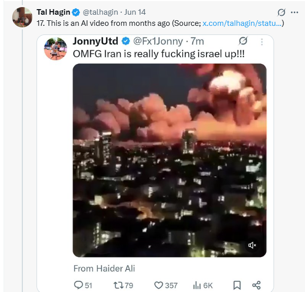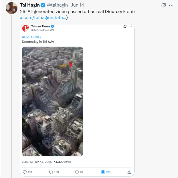 1. Many of the examples showcased used to back-up the assertion that "1/3 of Tel Aviv was destroyed" or that Israel was damaged to an extreme extent was AI videos or videos that weren't from Israel.