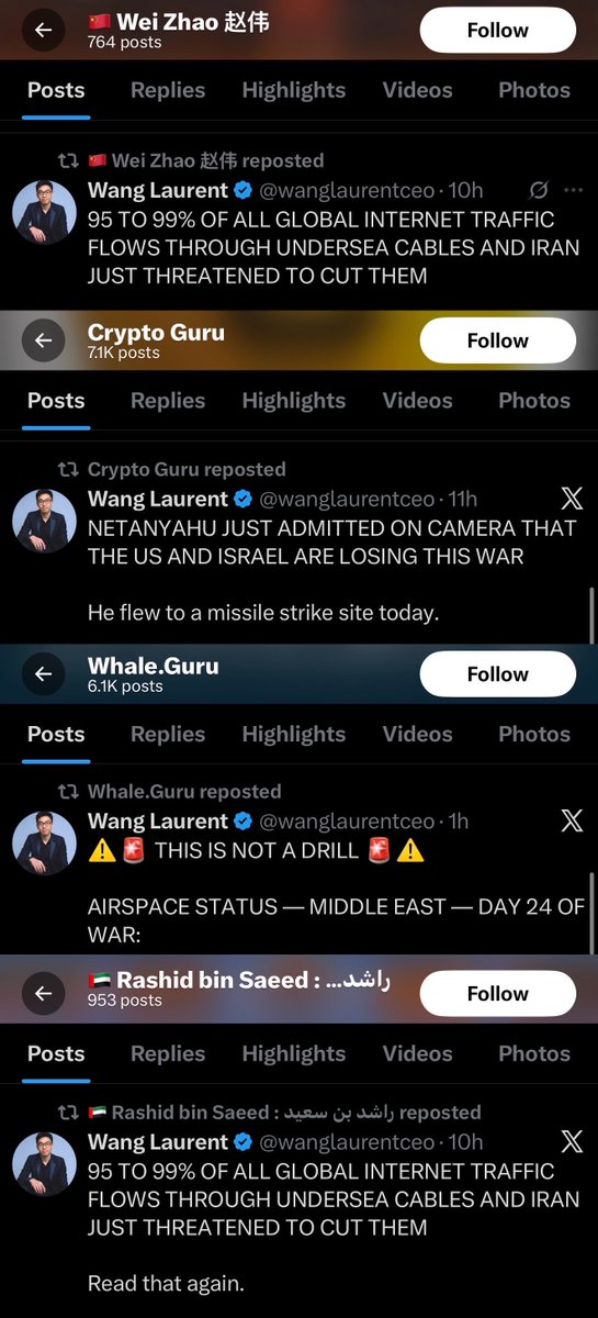 1/ I uncovered a coordinated network of 10+ accounts manufacturing viral panic about war and politics to drive traffic to crypto scams.