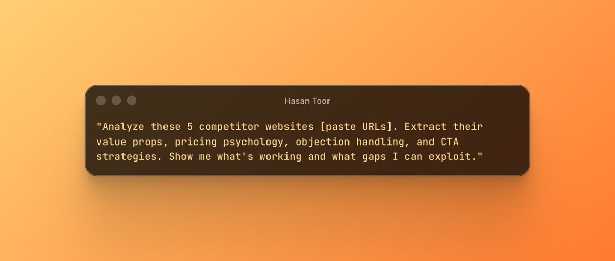 Prompt 1: "Analyze these 5 competitor websites [paste URLs]. Extract their value props, pricing psychology, objection handling, and CTA strategies. Show me what's working and what gaps I can exploit."