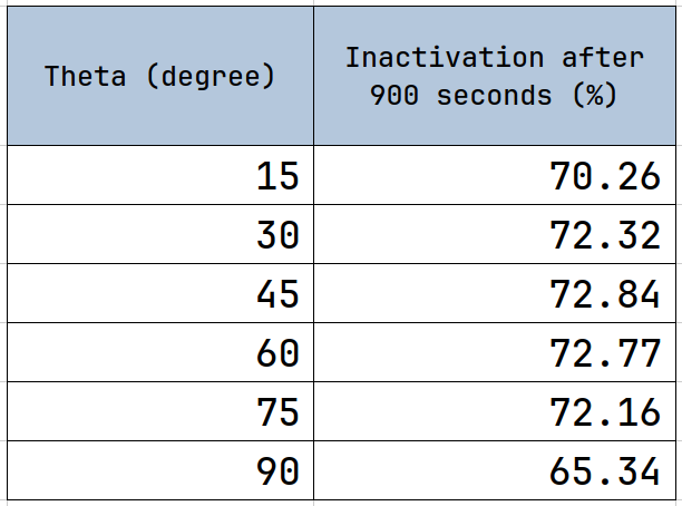 But, some of you might ask, how come the Torch kit emitted 96mW and could reduce the pathogen load by 73.66% and two Lanterns at a total of just 60mW in the same 30m3 chamber reduced the pathogen load by almost the same amount- 74.66%? One is pumping a lot more power into the air?