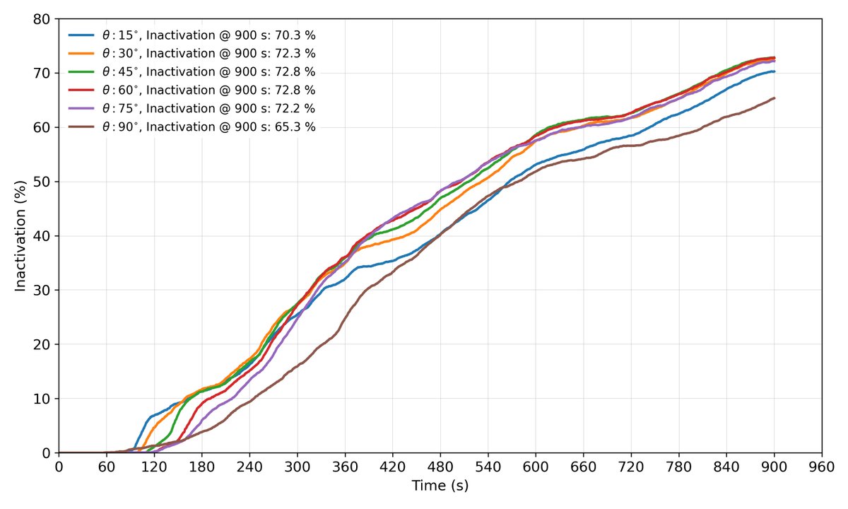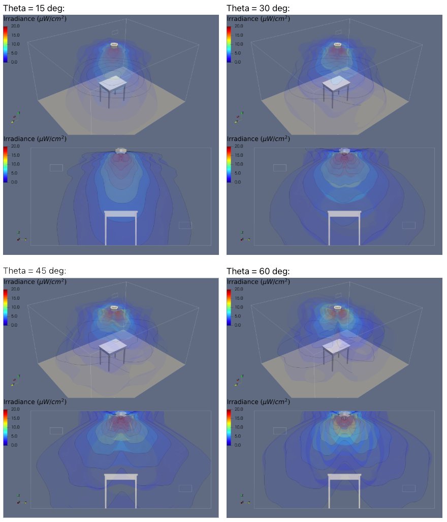 You can see from the models below how optimized angles improve coverage, and so inactivation. Most companies just slap a USHIO or off-the-shelf excimer bulb in an enclosure and call it a day- but unoptimized designs mean higher cost for the same effect.