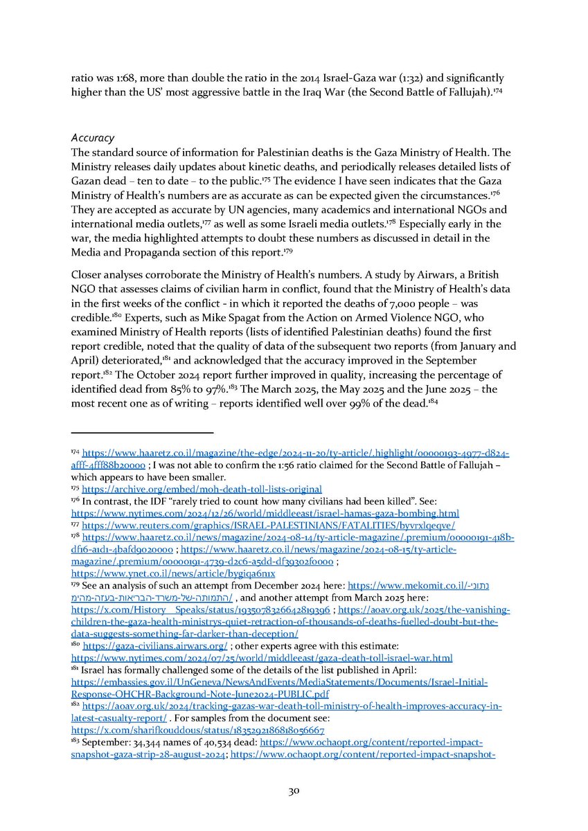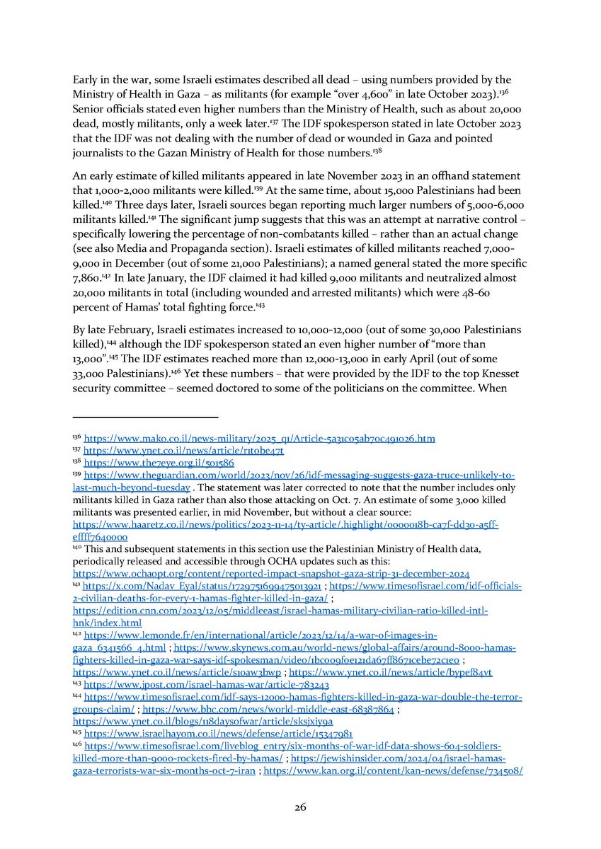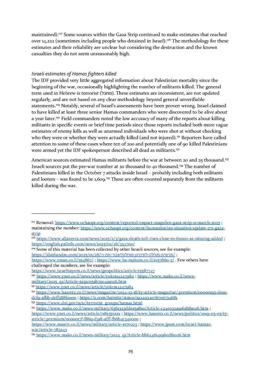 3/ Section 1⃣ examines what is currently known about the violent deaths of Palestinians. It covers the key numbers (at least 57K Palestinians killed and 134K injured), Israeli estimates of Hamas fighters killed and their problems, the ratio of non-combatant deaths (>67%),