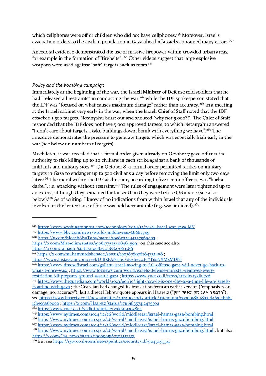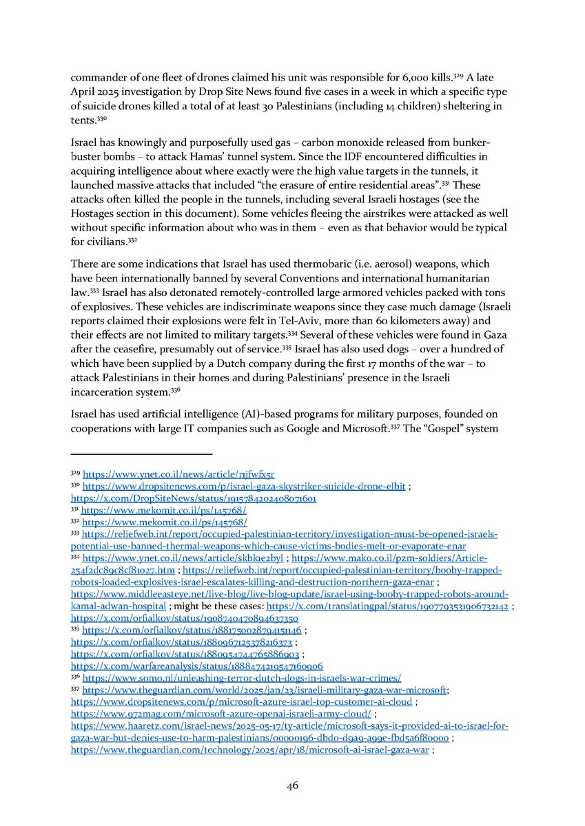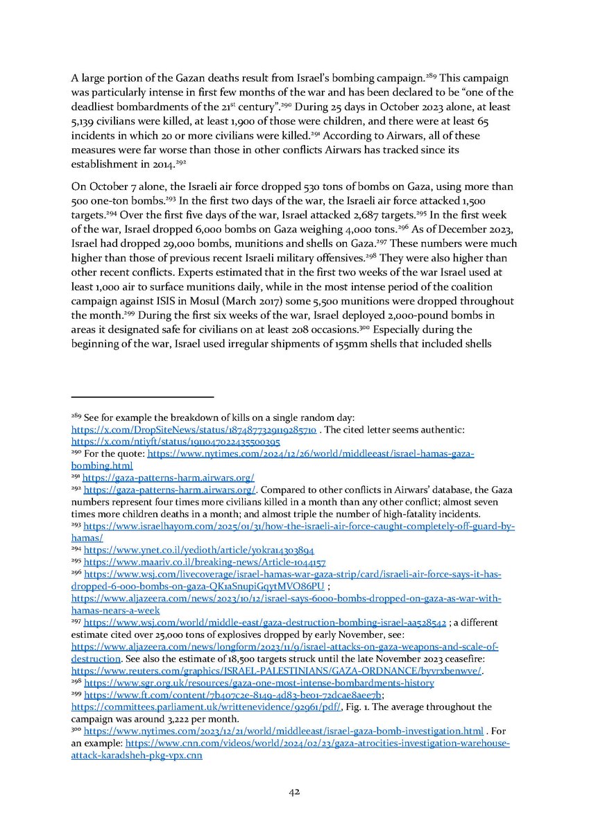 5/ Section 3⃣ examines the indiscriminate and disproportionate Israeli attacks. It zooms in to the policy underlying the bombing campaign as well as its extent and results over time. An additional subsection details some of the weapons used in these attacks.