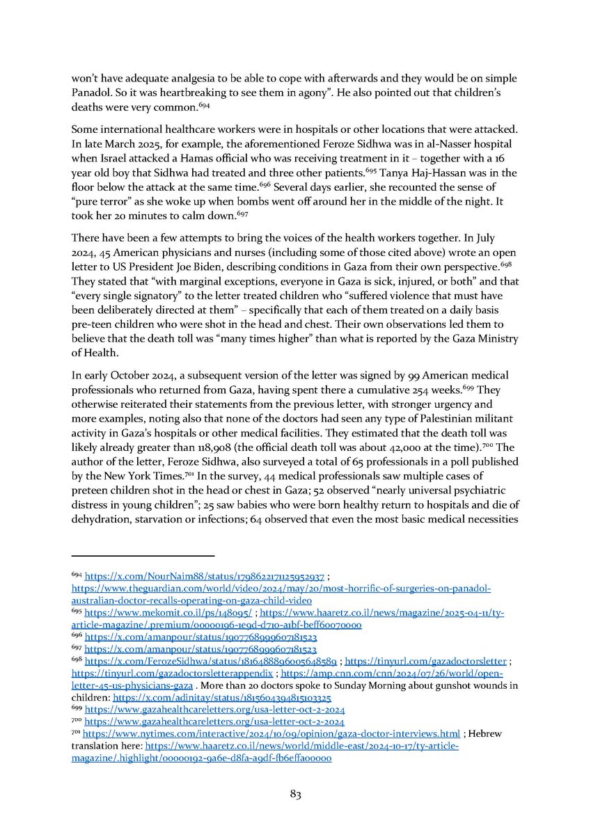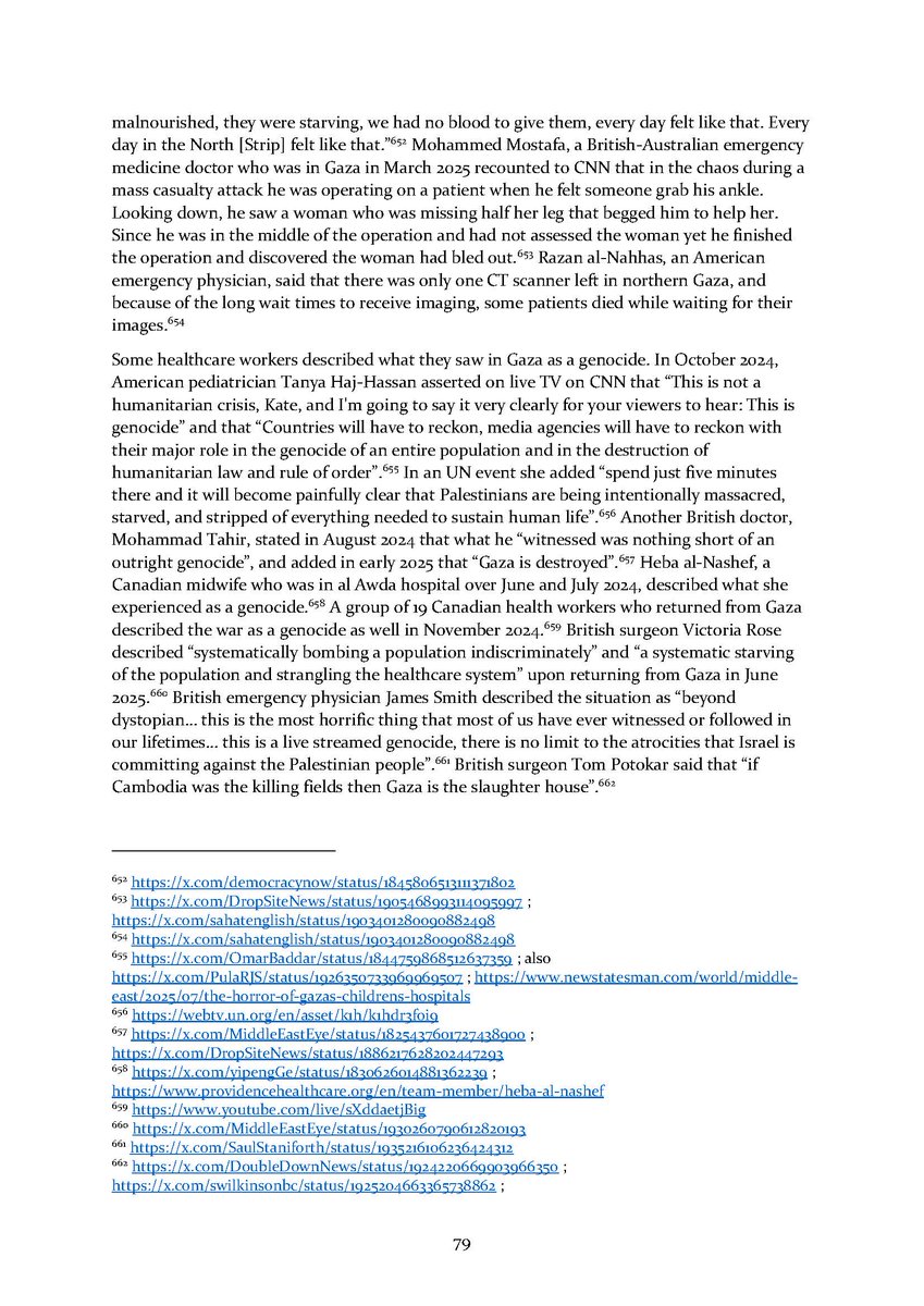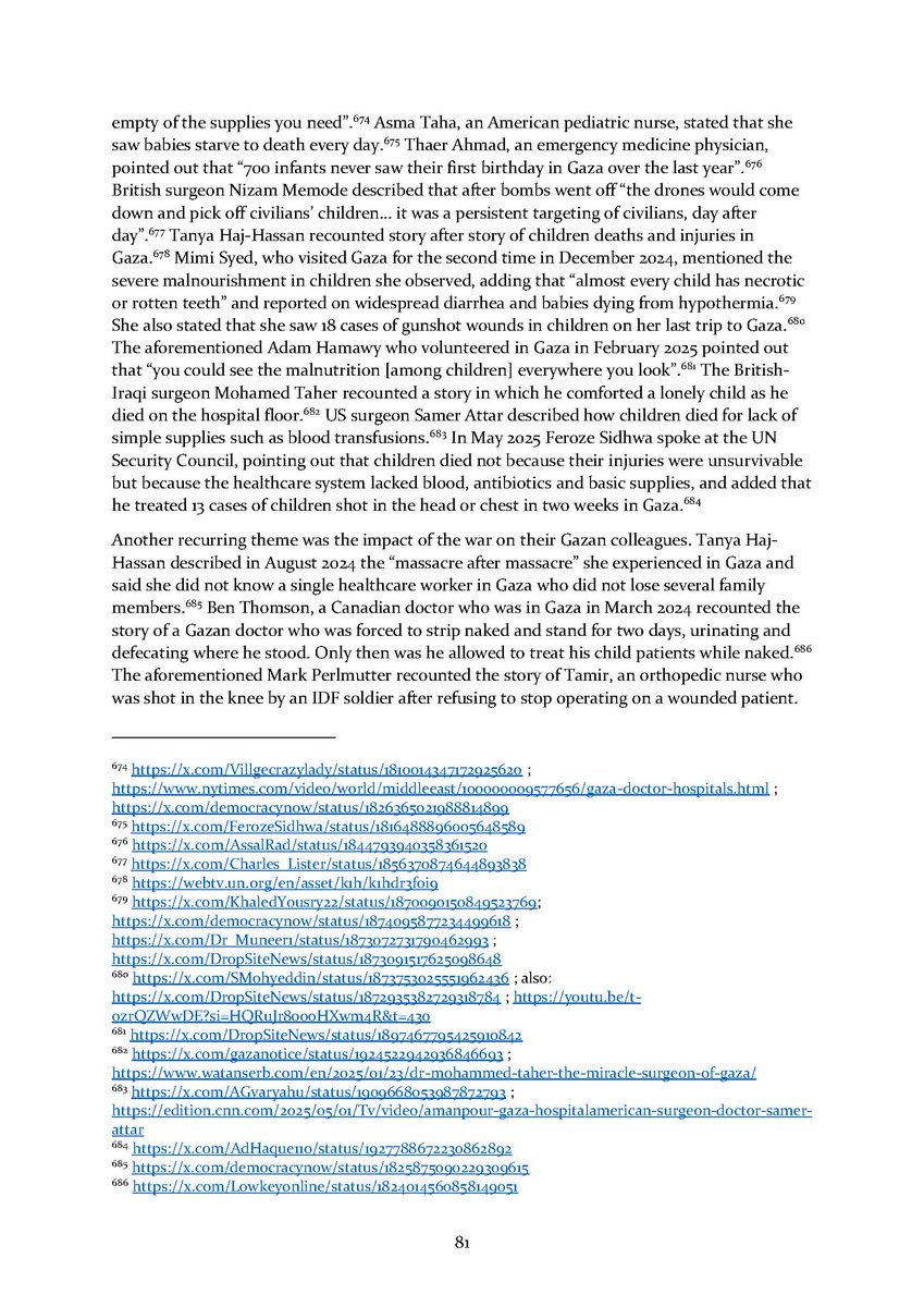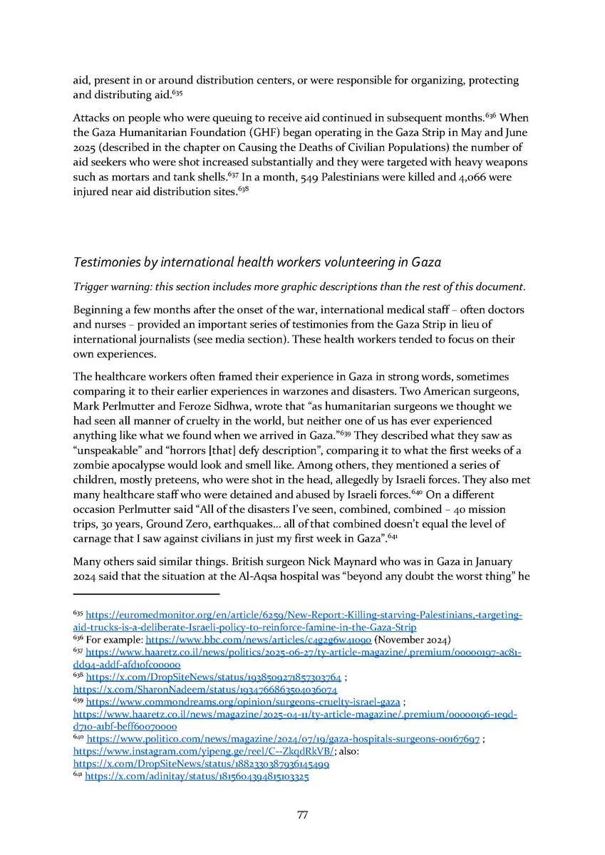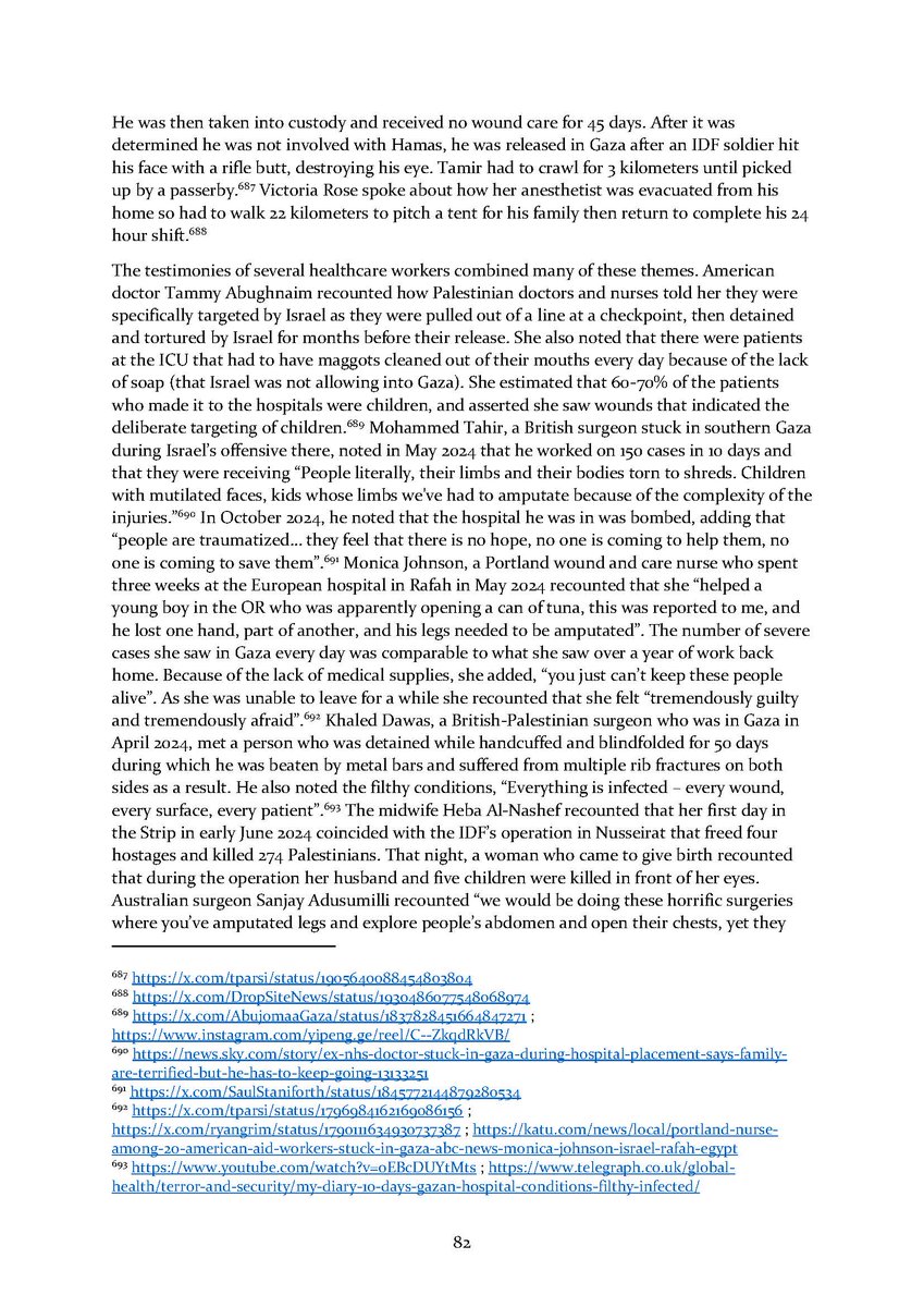 8/ Section 7⃣ describes attacks on aid workers and aid seekers. Section 8⃣ includes dozens of testimonies by international health workers who volunteered in Gaza over the conflict.