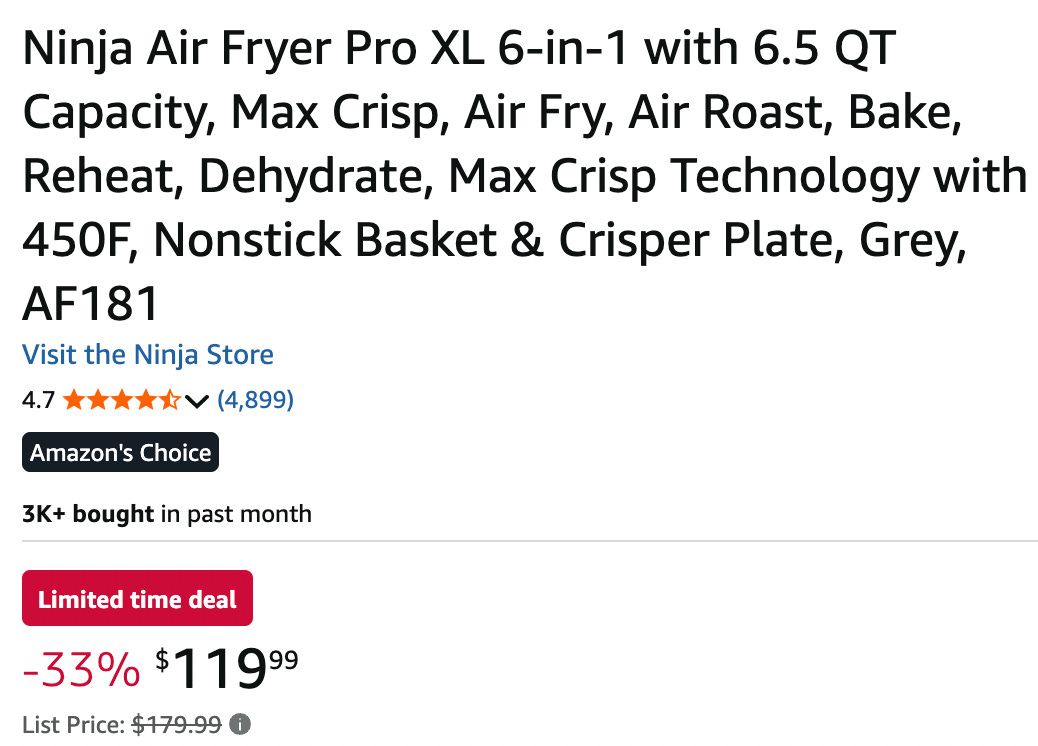 5. The Ninja Air Fryer Pro XL is on sale for $119.99, which Amazon says is a 33% discount off the list price of $179.99.