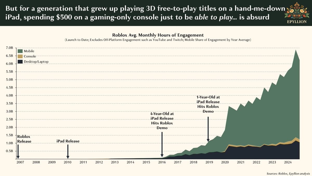 They began with always on titles like Minecraft, and then grew even further with Roblox. The generation of Roblox players have no sense of games as individual pieces of content. Roblox is a platform, and on that platform is an infinite number of experiences. There is no need to leave the platform.