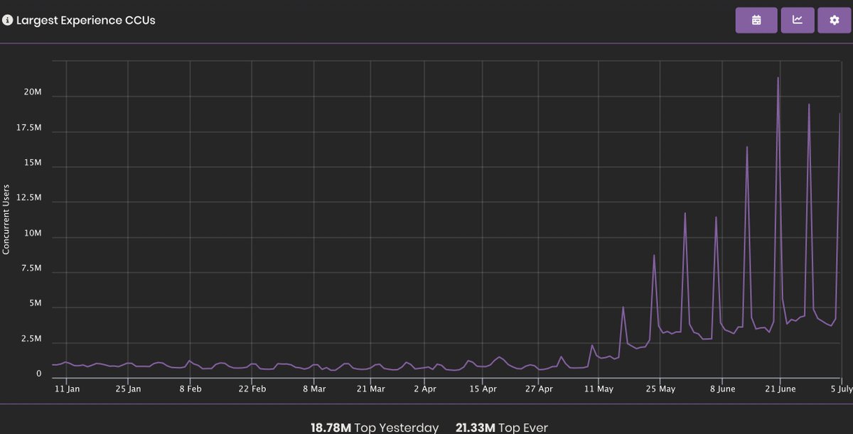 See "Grow a Garden." This Roblox game, in a matter of months, has far surpassed the concurrents of any western game in history, even Fortnite. It may not sustain this, it doesn’t need to. It grew Roblox as a platform tremendously. It made Roblox sticker, enabled more creators to build on Roblox, and brought more users to play Roblox games. Here is Roblox's CCU growth this year.