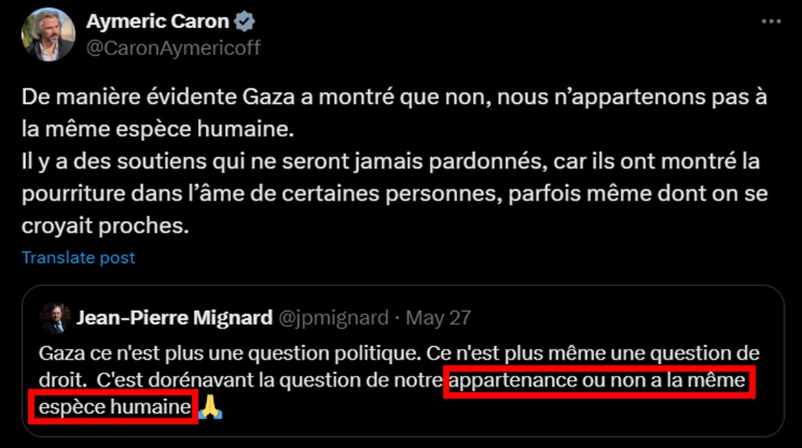 @jpmignard @YannBarte @Linformatrice1 De la même manière c'est par simple maladresse qu'il exclut de "l'espèce humaine" ceux qui défendent Israël contre le Hamas. Il ne pense pas vraiment qu'il faut être "un démon, un excrément, un déchet biologique".