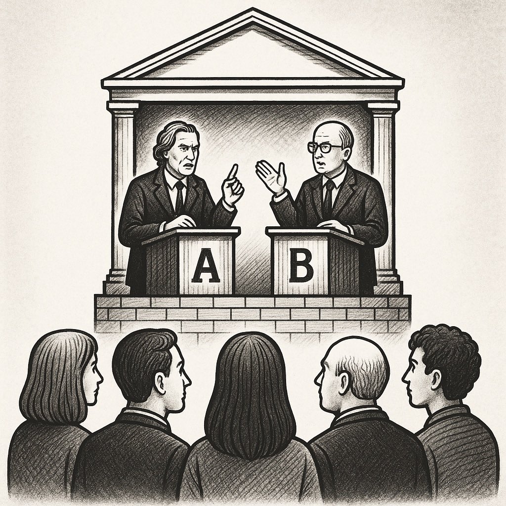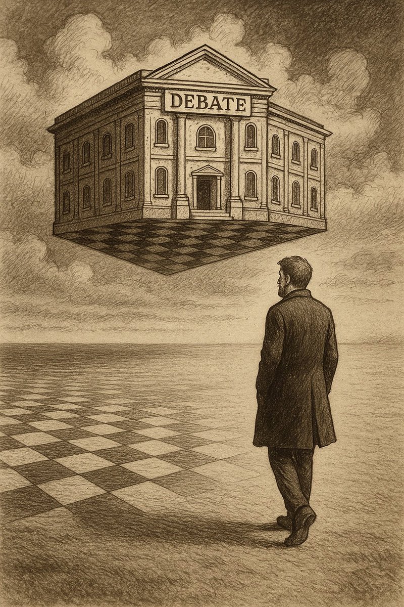 Each room had its own language; a curated dialect of slogans, technical terms and sacred words. But all of them were built using the same grammar; nominalist substitution. “Freedom” was redefined as unbound will. “Truth” as internal coherence. “Justice” as redistribution of harm. “Nature” as adaptive coding. “Liberty” as market access. “Reason” as narrative alignment. Each word became a costume, worn and discarded depending on the room. And yet, no one left the House. They only wandered room to room, confusing movement for meaning. Every doorway led to another pre-approved dilemma. Every answer produced new reactive loops. To challenge the premise of the House itself was forbidden; not by law, but by ridicule and in the House, reputation was cherished. Those who asked about its foundation were dismissed as ignorant, arrogant, regressive, dogmatic, conspiratorial, or insane. So they learned to stay in their rooms, reciting their scripts. Within the House, scholarly authorities convened to curate acceptable oppositions; carefully rehearsed debates (A v B) that reinforced the illusion of open inquiry, while excluding any argument that questioned the structure of the House itself.