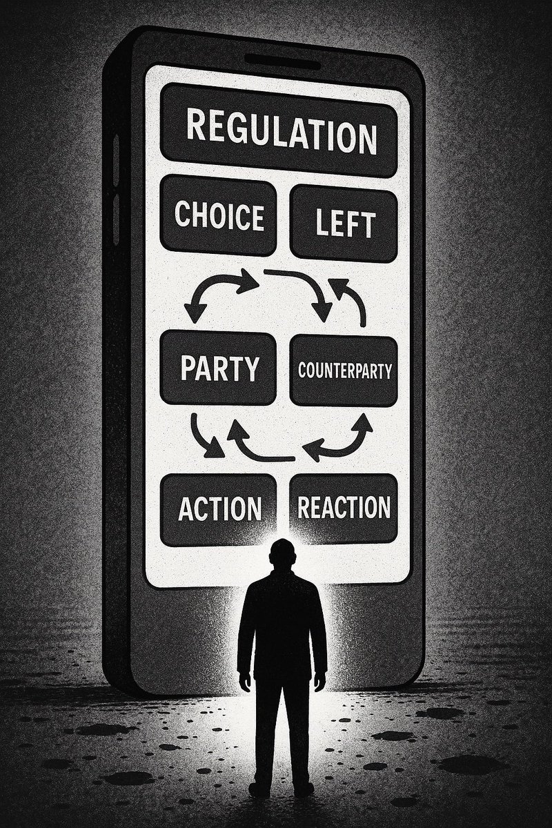 In time, Nomos was no longer needed. His protocols were automated. The House of a Thousand Rooms became a Technocratic Game Board. The managers were not philosophers now, but engineers of behaviour, trained in choice architecture, emotional nudging and behavioural compliance. They no longer needed to persuade. They simply designed the rooms. They controlled; what buttons could be pushed, which arguments could be made, what fears could be triggered and which rewards could be simulated. They created the illusion of choice and the people complied. Not out of fear nor out of tyranny as such, but because they believed they were ‘thinking’, not discerning that they were just consuming and reflexively repeating. All arguments were curated performances, carefully managed within boundaries that never touched reality. Audiences, conditioned by deracinated education, reacted not to truth but to aesthetic, identity and emotional charge; never noticing that both sides danced atop the same checkerboard floor.