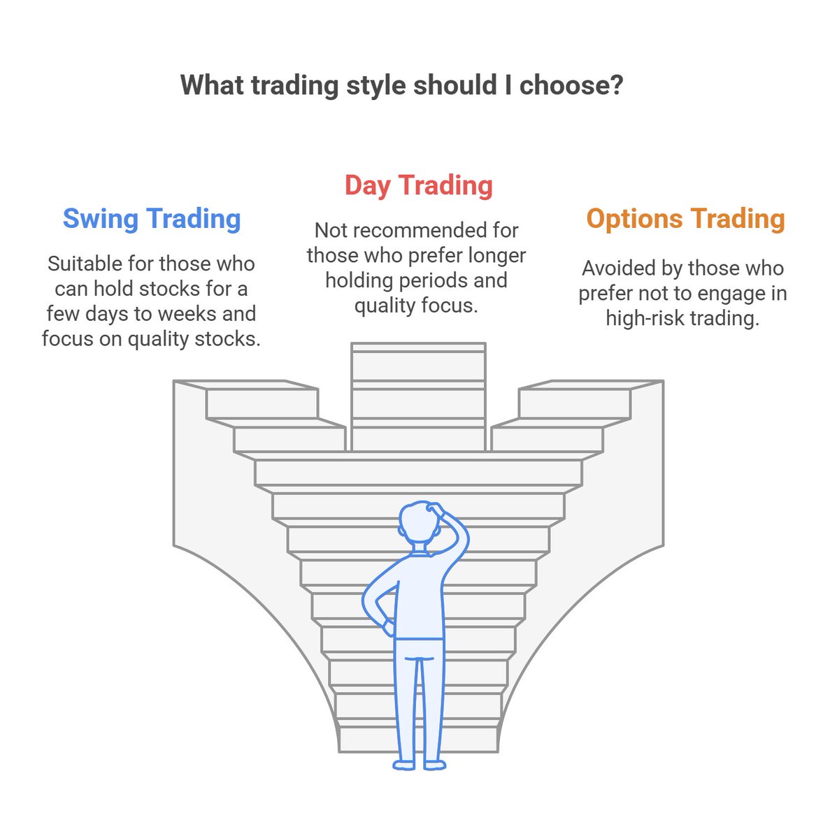 Deepak is a swing trader, typically holding stocks for a few days up to a couple of weeks. He avoids day trading and focuses on stocks, not options. Find a style that fits your personality and time constraints.