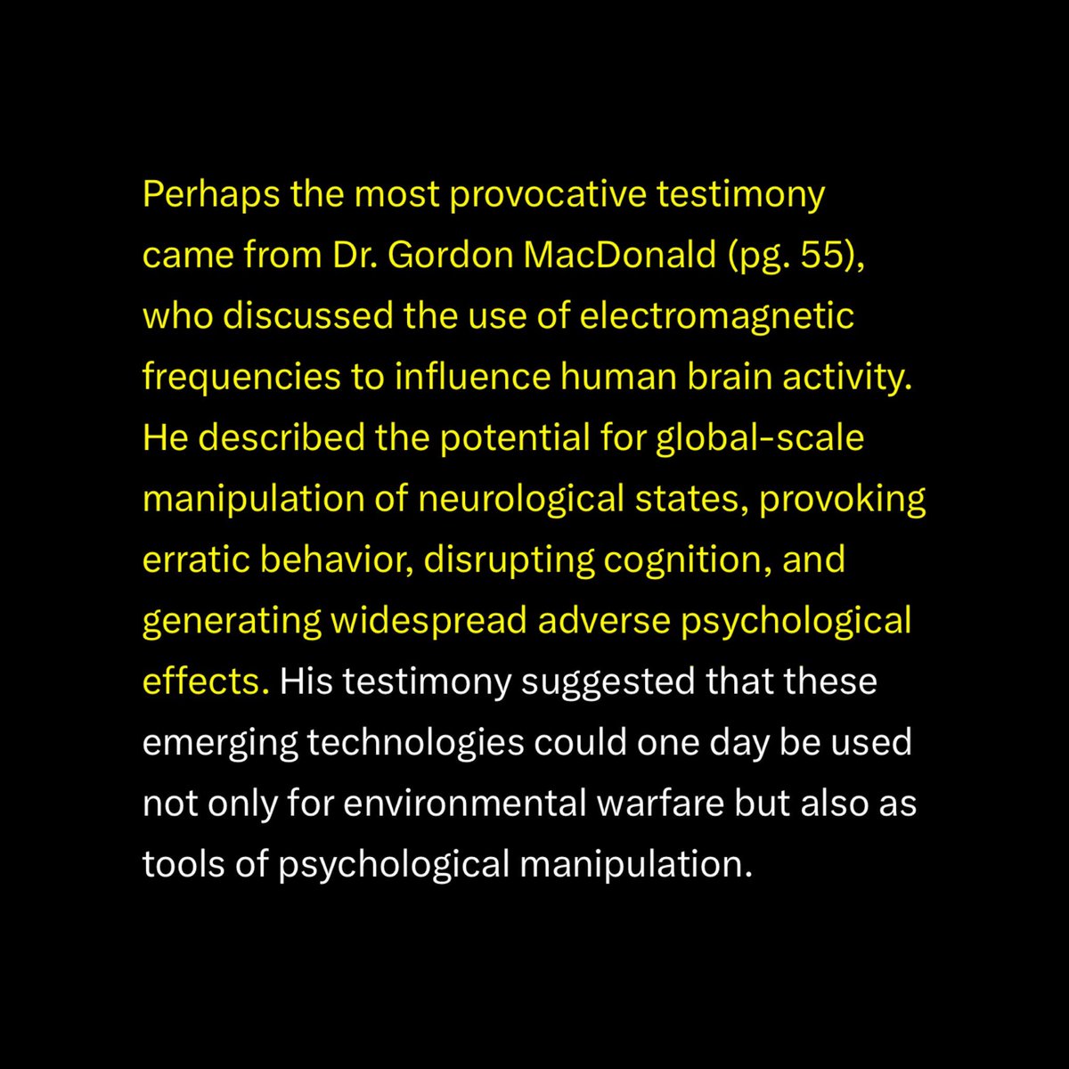 Dr. MacDonald warned of “global-scale manipulation of neurological states, provoking erratic behavior, disrupting cognition, and generating widespread adverse psychological effects.”