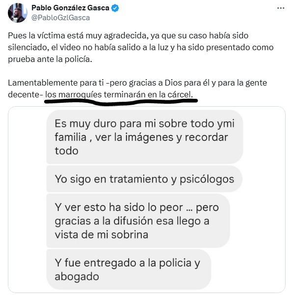 El primero que difundió el vídeo en twitter fue el responsable de Marketing Digital de VOX, dice que la víctima está agradecida por que así podrán meter a los marroquís en la cárcel. Cuando los agresores son españoles y ya están en la cárcel.