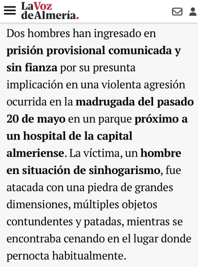 La persona a la que dieron una paliza que aparece en el vídeo difundido por neonazis, Alvise, Desokupa, Frente Obrero, VOX y su aparato mediático se llama José Moya, es de Almería y los dos chicos que le pegaron son españoles y están en la cárcel. Justicia para José y Domingo.